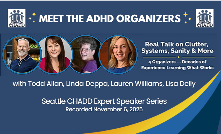 Whether you’re buried in papers, stuck with half-finished systems, or overwhelmed by digital clutter, this panel will cover what real organizing for ADHD can look like.