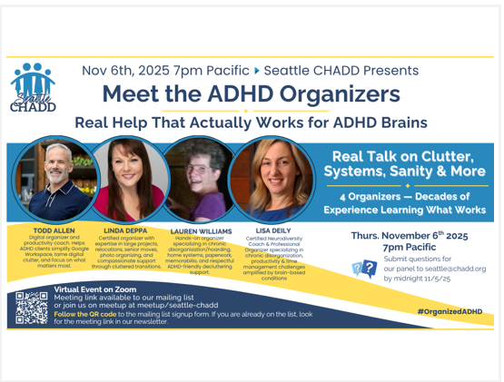 Curious what happens during our Seattle CHADD weekly meetings? Check out recordings of our past meetings to see what it’s all about! Whether you missed a session or want to revisit a topic, our recordings provide an excellent opportunity to catch up and stay connected with our community.